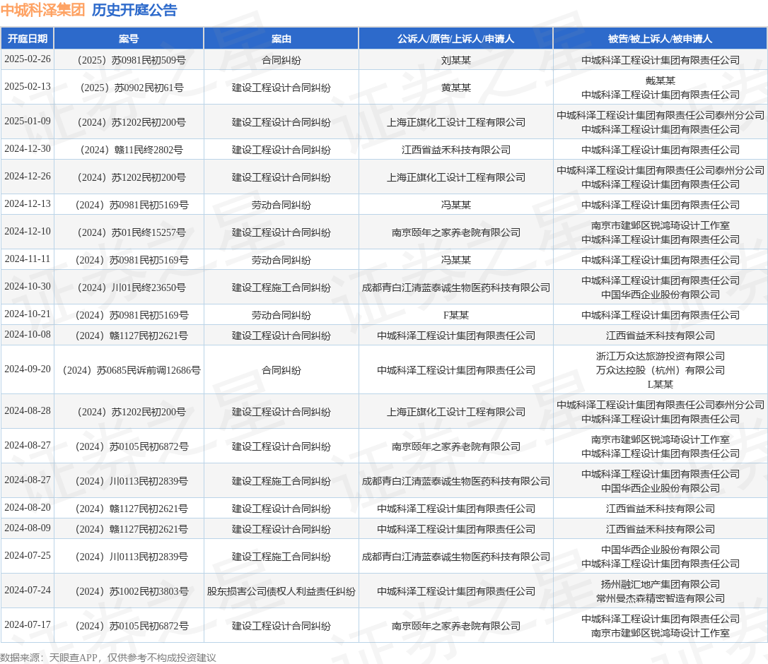 案号:(2025)苏0981民初509号审理法院:东台市人民法院案由:合同纠纷当事人信息: 原告/上诉人:刘某某 被告/被上诉人:中城科泽工程设计集团有限责任公司开庭日期:2025年2月26日根据统计,近一年内以中城科泽工程设计集团有限责任公司为当事人的历史开庭公告有25则,其中案由为“建设工程设计合同纠纷”的公告以15则居首,其次为“劳动合同纠纷”有3则,“合同纠纷”有3则。历史开庭公告(前20条)如下: